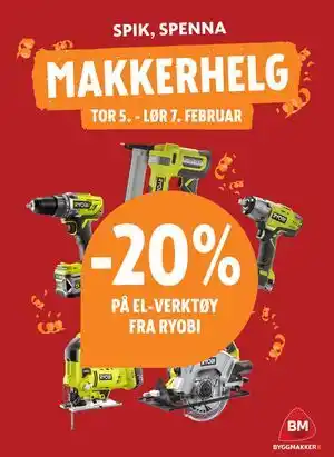 Byggmakker tilbyr et bredt utvalg av produkter, i tillegg til 20% PÅ EL-VERKTØY FRA RYOBI. Hold deg oppdatert med ukens Byggmakker kundeavis for å finne fantastiske tilbud og kampanjer. I tillegg til 20% PÅ EL-VERKTØY FRA RYOBI, kan du også finne disse tilbud: EL-sparkesykkel, El-motorsykkel & Alle lagerførte snøfresere fra ariens og ryobi.