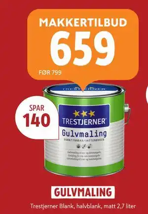 Prisen på GULVMALING finner du øverst på siden, sammen med datoene da tilbudet er tilgjengelig. Du kan sjekke prisen i gjeldende Byggmakker kundeavis eller på Byggmakker nettsiden, hvis du vil. Kampanjer og spesial tilbud gir deg en sjans om å kjøpe Byggmakker produkter til den laveste prisen.