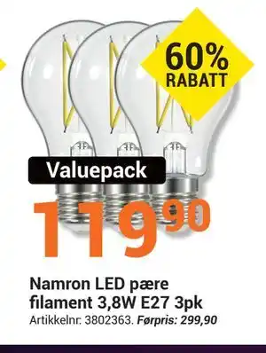 Nå på tilbud hos Elektroimportøren: Namron LED pære filament 3,8W E27 3pk ✅ Gyldig fra 1-01 til 18-01.
