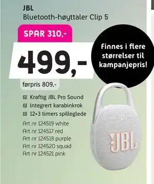 Denne Bluetooth-høyttaler Clip 5 er nå på kampanje hos ELON. Her finner du oppdatert pris, kampanjevilkår og varighet. Sammenlign med andre lignende kampanjer for å sikre best mulig kjøp. Kampanjen varer fra 16-02-2026 til 01-03-2026. Hvis den utløper, kan du se andre aktuelle tilbud. Følg produktkategorien for å vite når Bluetooth-høyttaler Clip 5 igjen er på kampanje, og vurder om det lønner seg å vente for å handle billigere senere.Spørsmål og svar om Bluetooth-høyttaler Clip 5