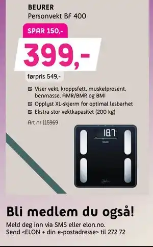 Prisen på Personvekt BF 400 finner du øverst på siden, sammen med datoene da tilbudet er tilgjengelig. Du kan sjekke prisen i gjeldende ELON kundeavis eller på ELON nettsiden, hvis du vil. Kampanjer og spesial tilbud gir deg en sjans om å kjøpe ELON produkter til den laveste prisen.
