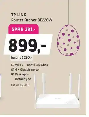 Nå på tilbud hos ELON: TP-LINK Router Archer BE220W ✅ Gyldig fra 23-03 til 12-04.