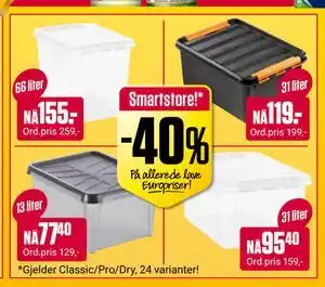 Europris tilbyr et bredt utvalg av produkter, i tillegg til Smartstore!. Hold deg oppdatert med ukens Europris kundeavis for å finne fantastiske tilbud og kampanjer. I tillegg til Smartstore!, kan du også finne disse tilbud: 40% SMARTSTORE CLASSIC, SMARTSTORE oppbevaringsboks & SMARTSTORE CLASSIC 10.