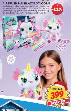 Nå på tilbud hos Extra Leker: AIRBRUSH PLUSH AXOLOTLCORN, NOK 399 ✅ Gyldig fra 12-11 til 24-12.