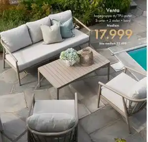 Fagmøbler tilbyr et bredt utvalg av produkter, i tillegg til Venta. Hold deg oppdatert med ukens Fagmøbler kundeavis for å finne fantastiske tilbud og kampanjer. I tillegg til Venta, kan du også finne disse tilbud: Venta hagegruppe m/TPU-puter 3-seter + 2 stoler + bord, tilbud 2 & tilbud 3.