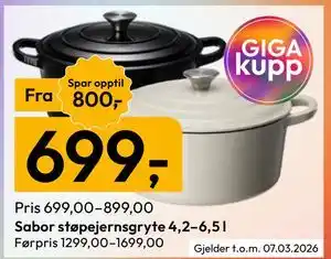 Nå på tilbud hos Gigaboks: Sabor støpejernsgryte 4,2–6,5 l ✅ Gyldig fra 23-02 til 28-02.