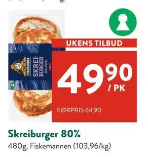 Prisen på Skreiburger 80% finner du øverst på siden, sammen med datoene da tilbudet er tilgjengelig. Du kan sjekke prisen i gjeldende Jacobs kundeavis eller på Jacobs nettsiden, hvis du vil. Kampanjer og spesial tilbud gir deg en sjans om å kjøpe Jacobs produkter til den laveste prisen.