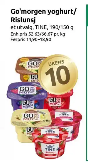 Prisen på Go'morgen yoghurt/ Rislunsj finner du øverst på siden, sammen med datoene da tilbudet er tilgjengelig. Du kan sjekke prisen i gjeldende Joker kundeavis eller på Joker nettsiden, hvis du vil. Kampanjer og spesial tilbud gir deg en sjans om å kjøpe Joker produkter til den laveste prisen.