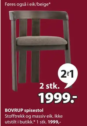 JYSK tilbyr et bredt utvalg av produkter, i tillegg til BOVRUP spisestol, NOK 1999. Hold deg oppdatert med ukens JYSK kundeavis for å finne fantastiske tilbud og kampanjer. I tillegg til BOVRUP spisestol, NOK 1999, kan du også finne disse tilbud: Celina spisestol, NOK 1299, JYDERUP spisestol, NOK 1099 & EJSTRUP spisestol, NOK 799.