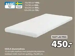 HASLA skummadrass er denne uken tilgjengelig hos JYSK med en attraktiv rabatt. Her finner du informasjon om gjeldende pris, kampanjevilkår og spesialrabatter. Tilbudet gjelder i uke 05. Er det utløpt, kan du se andre aktuelle tilbud. Følg produktkategorien for å motta varsler når HASLA skummadrass igjen har en gunstig pris hos JYSK.Spørsmål og svar om HASLA skummadrass