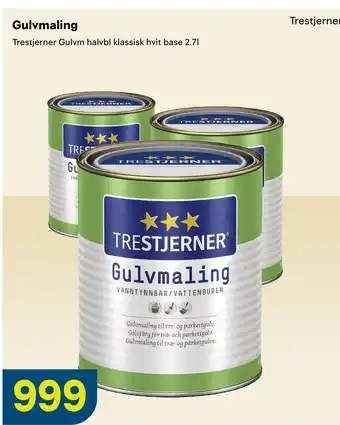 Dette tilbudet kan finnes i forskjellige butikker. Ta en titt på alle produkter for å få det billigste Trestjerner Gulvmaling. Hvis du vil finne ut om dette produktet har en større rabatt i en annen butikk, sjekk kategorien 'Bygg'. Du vil sikkert se disse tilbudene også: TRESTJERNER GULVMALING, TRESTJERNER GULVMALING & Gulvmaling.