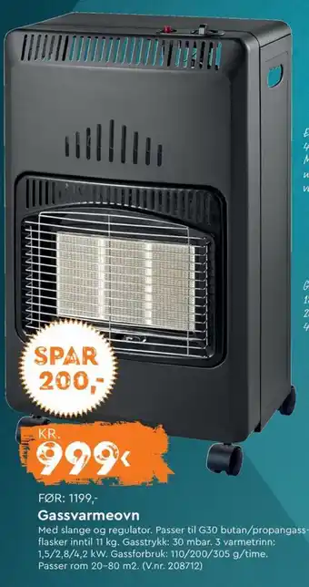 Med slange og regulator. Passer til G30 butan/propangass- flasker inntil 11 kg. Gasstrykk: 30 mbar. 3 varmetrinn: 1,5/2,8/4,2 kW. Gassforbruk: 110/200/305 g/time. Passer rom 20-80 m2. (V.nr. 208712)