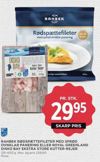 Rahbek rødspættefileter med sprød ovnklar panering eller royal greenland disko bay ekstra store kutter-rejer 125-400 g