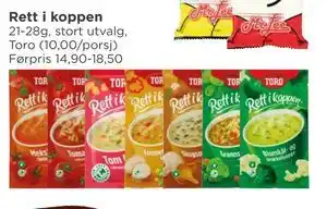 Dette tilbudet kan finnes i forskjellige butikker. Ta en titt på alle produkter for å få det billigste Rett i koppen. Hvis du vil finne ut om dette produktet har en større rabatt i en annen butikk, sjekk kategorien 'Matvarebutikk'. Du vil sikkert se disse tilbudene også: Rett i koppen, TORO RETT I KOPPEN & TORO RETT I KOPPEN.