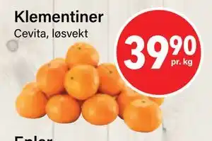 Dette tilbudet kan finnes i forskjellige butikker. Ta en titt på alle produkter for å få det billigste Klementiner. Hvis du vil finne ut om dette produktet har en større rabatt i en annen butikk, sjekk kategorien 'Matvarebutikk'. Du vil sikkert se disse tilbudene også: ET UTVALG GILDE- OG PRIORPRODUKTER, FREIA SMÅSJOKOLADER & TINE NORSK GRÄDDOST.