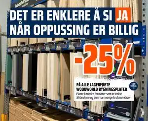25%. PÅ ALLE LAGERFØRTE WOODWORLD BYGNINGSPLATER-kampanje hos Obs Bygg