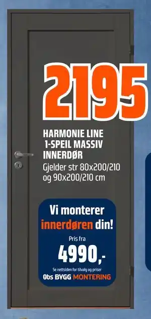 Prisen på HARMONIE LINE 1-SPEIL MASSIV INNERDØR finner du øverst på siden, sammen med datoene da tilbudet er tilgjengelig. Du kan sjekke prisen i gjeldende Obs Bygg kundeavis eller på Obs Bygg nettsiden, hvis du vil. Kampanjer og spesial tilbud gir deg en sjans om å kjøpe Obs Bygg produkter til den laveste prisen.