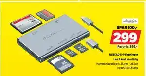 USB 3.0 5-i-1 kortleser er nå tilgjengelig med rabatt hos POWER. Her finner du oppdatert pris, kampanjevilkår og varighet på tilbudet. Sjekk også andre lignende kampanjer for å sikre at du kjøper til best mulig pris. Rabattkampanjen varer fra 31-12-2025 til 25-01-2026. Er den utløpt, kan du finne andre aktuelle tilbud. Følg produktkategorien for å få beskjed når USB 3.0 5-i-1 kortleser er tilbake med rabatt hos POWER.Spørsmål og svar om USB 3.0 5-i-1 kortleser