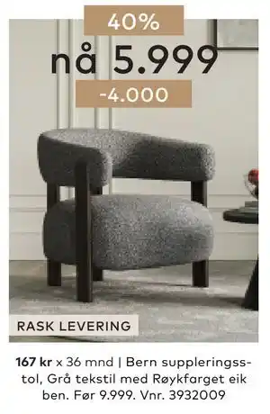 Bern suppleringsstol er nå på tilbud hos Skeidar fra 16-04-2026 til 17-05-2026. Bestill Bern suppleringsstol online via Skeidar sin nettside eller kjøp til en god pris. På Kundeavisogtilbud.no finner du alltid de beste Bern suppleringsstol-tilbudene. Sammenlign dagens kampanjer og sjekk om Bern suppleringsstol kommer tilbake med rabatt neste uke. Vi oppdaterer raskt, slik at du kan planlegge kjøpene dine smart.Spørsmål og svar om Bern suppleringsstol