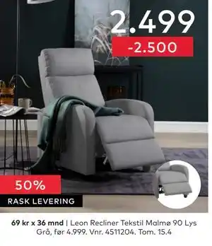 Leon Recliner er denne uken tilgjengelig hos Skeidar med en attraktiv rabatt. Her finner du informasjon om gjeldende pris, kampanjevilkår og spesialrabatter. Tilbudet gjelder i uke 12. Er det utløpt, kan du se andre aktuelle tilbud. Følg produktkategorien for å motta varsler når Leon Recliner igjen har en gunstig pris hos Skeidar.Spørsmål og svar om Leon Recliner