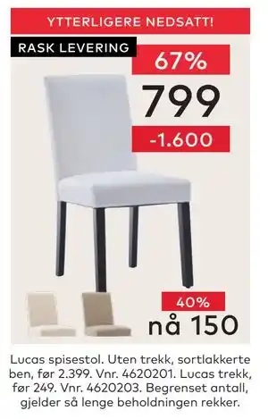 Skeidar tilbyr et bredt utvalg av produkter, i tillegg til Lucas trekk. Hold deg oppdatert med ukens Skeidar kundeavis for å finne fantastiske tilbud og kampanjer. I tillegg til Lucas trekk, kan du også finne disse tilbud: Lucas spisestol, VÄdra Trekk til stellematte, hvit, 75x74 cm & VÄdra Trekk til stellematte, hvit, 48x74 cm.