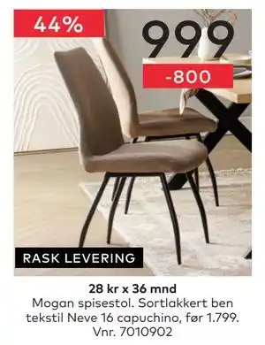 Denne Mogan spisestol er nå på tilbud hos Skeidar. Sjekk siste kampanjer med konkurransedyktig pris og gode rabatter. Du kan bestille Mogan spisestol online via Skeidar sin nettside eller kjøpe til lavest tilgjengelig pris. Kundeavisogtilbud.no samler alltid de beste Mogan spisestol-tilbudene for deg. Vil du være først med å vite om nye kampanjer? Aktiver varsler og få beskjed når Mogan spisestol er på tilbud igjen.Spørsmål og svar om Mogan spisestol