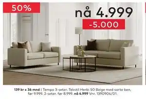 Dette tilbudet kan finnes i forskjellige butikker. Ta en titt på alle produkter for å få det billigste Tempo 3-seter. Hvis du vil finne ut om dette produktet har en større rabatt i en annen butikk, sjekk kategorien 'Møbler og Interiør'. Du vil sikkert se disse tilbudene også: Tempo hjørnesofa, VELA 3 seter & Denver 2-seter.