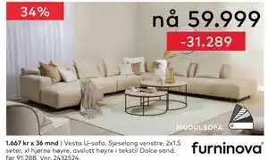 Vesta U-sofa er denne uken tilgjengelig hos Skeidar med en attraktiv rabatt. Her finner du informasjon om gjeldende pris, kampanjevilkår og spesialrabatter. Tilbudet gjelder i uke 02. Er det utløpt, kan du se andre aktuelle tilbud. Følg produktkategorien for å motta varsler når Vesta U-sofa igjen har en gunstig pris hos Skeidar.Spørsmål og svar om Vesta U-sofa