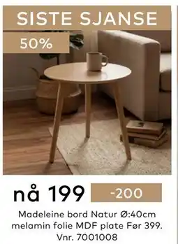 | 4 | Madeleine bord 1 stk | Skeidar | 399,00 kr | 199,00 kr | 200,00 kr Rabatt | 12 februar 2026 | 15 mars 2026 | Se tilbudet | |