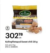 | Kyllingfiletspyd Sweet chili 30 g | Storcash | 302,60 kr | 12 januar 2026 | 07 februar 2026 | |||