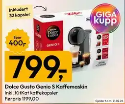 | Dolce Gusto Genio S Kaffemaskin 1 stk | Gigaboks | 1 199,00 kr | 799,00 kr | 400,00 kr Rabatt | 09 februar 2026 | 21 februar 2026 | |