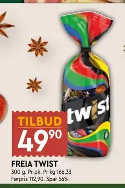 | 1 | FREIA TWIST 300 g | Coop Mega | 112,90 kr | 49,90 kr | Spar 56% | 22 desember 2025 | 27 desember 2025 | Se tilbudet | |