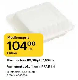 | 5 | Varmmatboks 1 rom PFAS-fri 900 ml | Storcash | 86,00 kr | 13 april 2026 | 09 mai 2026 | Se tilbudet |