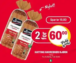 | 1 | Hatting havrebrød bjørn 2 x 700 g | Coop Extra | 60,00 kr | 2 for 60 | 02 mars 2026 | 08 mars 2026 | Se tilbudet | ||