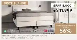 | Glow jubileum kontinentalseng 150x200 cm 1 stk | Skeidar | 19 999,00 kr | 11 999,00 kr | 8 000,00 kr Rabatt | 02 januar 2026 | 18 januar 2026 | |