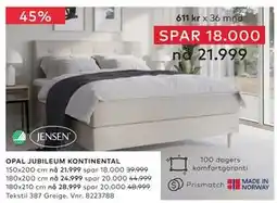 | Jensen Opal Jubileum kontinental 150x200 cm | Skeidar | 31 999,00 kr | 21 999,00 kr | 10 000,00 kr Rabatt | 20 februar 2024 | 26 februar 2024 | |