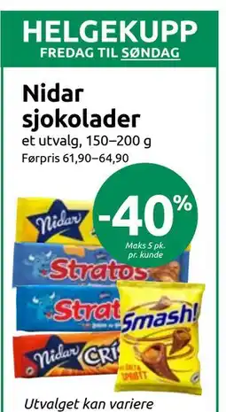 | 1 | Nidar sjokolader 150-200 g | Joker | 19 desember 2025 | 21 desember 2025 | Se tilbudet | ||||
