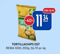 | 2 | Tortillachips ost 200 g | Rema 1000 | 18,90 kr | 11,34 kr | -40% | 13 april 2026 | 19 april 2026 | Se tilbudet | |