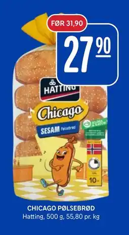 | Hatting Chicago pølsebrød 500 g | Rema 1000 | 31,90 kr | 27,90 kr | 4,00 kr Rabatt | 01 mars 2026 | 15 mars 2026 | |