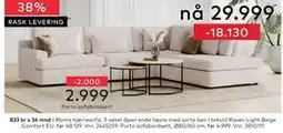 | Roma hjørnesofa 3-seter | Skeidar | 18 699,00 kr | 9 999,00 kr | 8 700,00 kr Rabatt | 02 januar 2025 | 11 februar 2025 | |
