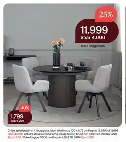 | Chiba spisebord med integrert ileggsplate | Møbelringen | 13 999,00 kr | 10 999,00 kr | 3 000,00 kr Rabatt | 16 oktober 2023 | 29 oktober 2023 | |