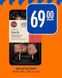 | 2 | GRILLSPYD STORFE 180 g | Rema 1000 | 69,00 kr | 27 april 2026 | 02 mai 2026 | Se tilbudet | |||