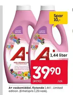 | A+ flytende vaskemiddel 4,62 l 4.62 l | Gigaboks | 199,00 kr | 149,00 kr | 50,00 kr Rabatt | 30 mars 2026 | 04 april 2026 | |