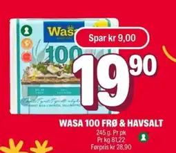 | Wasa 100 frø & havsalt 245 g | Coop Extra | 28,90 kr | 19,90 kr | Spar kr 9,00 | 19 januar 2026 | 25 januar 2026 | |