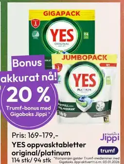Gigaboks YES oppvasktabletter original 114 stk / platinum 94 stk tilbud